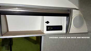 Airstream Trailer. Upgraded single din to a double din Kenwood receiver. Ran video out line and speaker wires for outside speakers and sub amp wires. Installed Rockford amp & 10" slim woofer. Installed outside TV mount for 48" TV & weatherproof power outlet and speaker jacks.
