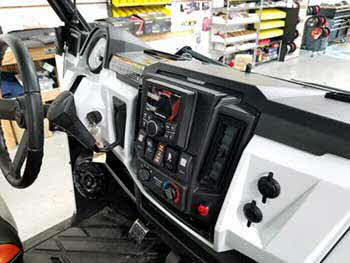 Ranger side by side audio upgrade. Made a custom panel to install a Rockford Fosgate controller into the dash pocket. Also installed SSV Works kick panels to house Kenwood marine speakers and installed a side mount AM/FM antenna
