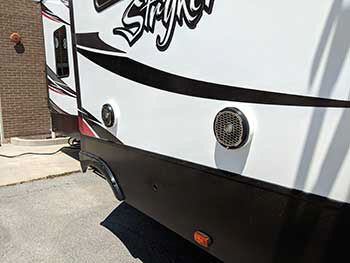 Stryker toy hauler in for an audio upgrade. Installed Rockford element ready Power Series amps & upgraded exisitng speakers inside & out with Rockford then added a 10" subwoofer to both the inside & outside systems.